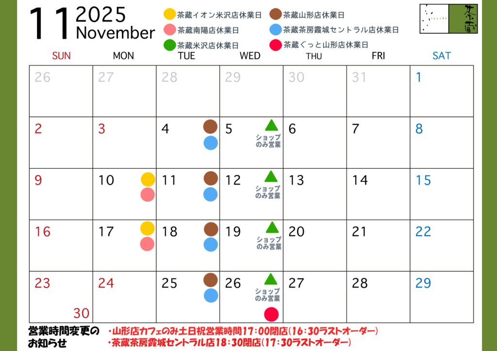 茶蔵カレンダー/各店の休業日/時短営業日のお知らせ