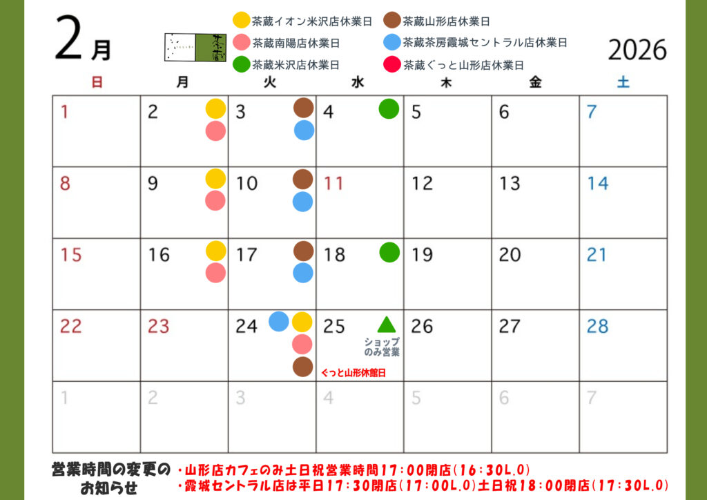 - 2026年1月30日・店舗のご案内・TOPページ・茶蔵カレンダーを更新